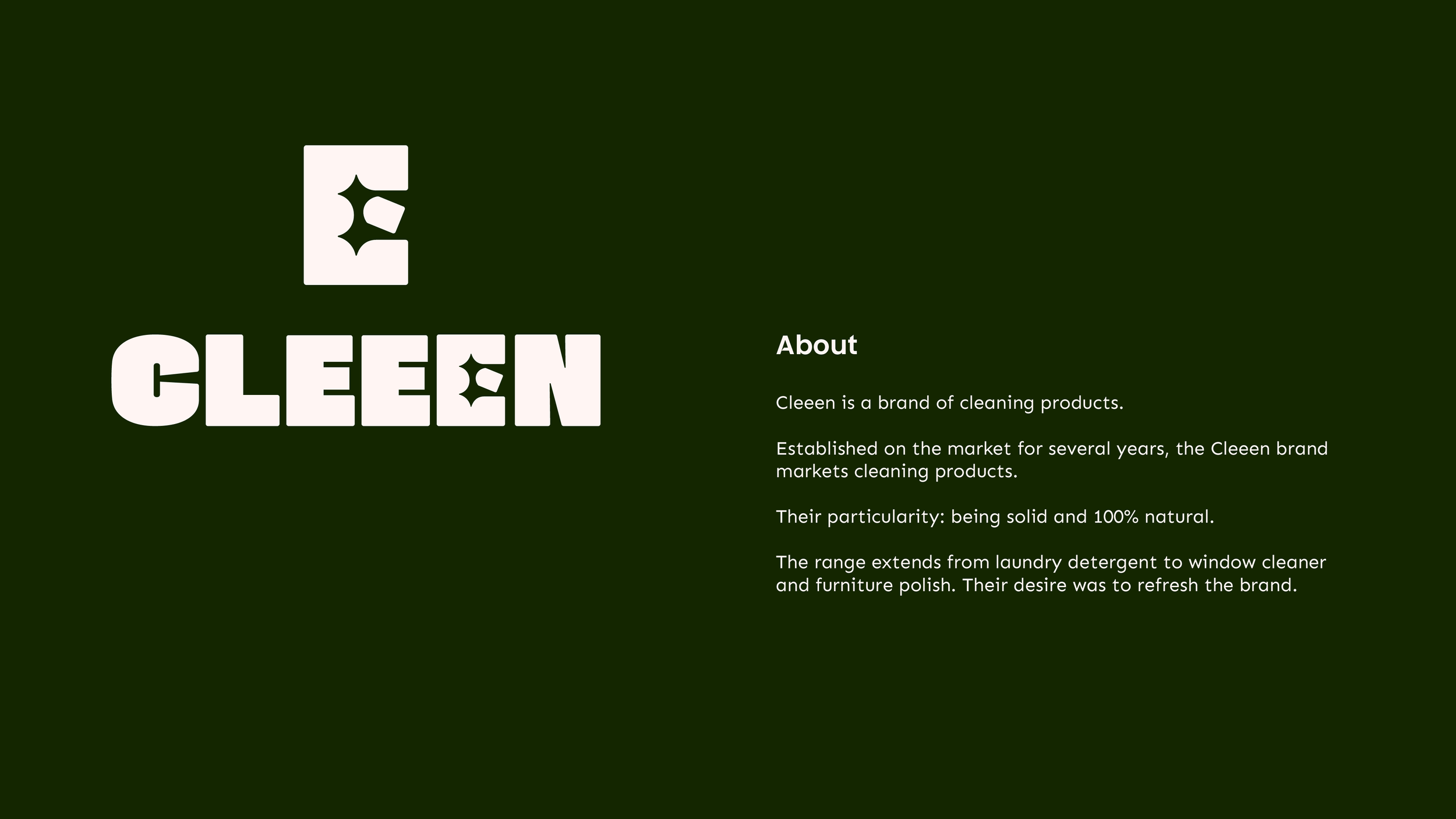 Cleeen is a brand of eco-friendly, solid, and 100% natural cleaning products. The range includes everything from laundry detergent to window cleaner and furniture polish, offering sustainable alternatives to conventional household products. The goal of this rebranding was to modernize the brand’s identity, making it more engaging and aligned with its eco-conscious values while maintaining a professional and trustworthy look.